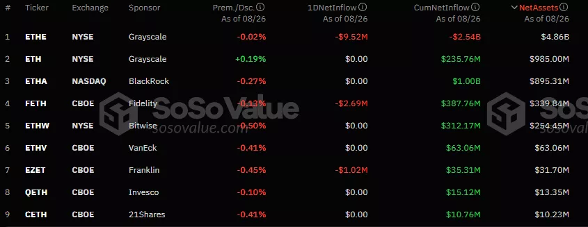Совокупный отток из Grayscale Ethereum Trust (ETHE) повысился до $2,54 млрд. 26 августа показатель вырос на $9,5 млн.