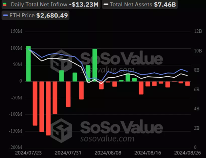 Отток с 19 по 23 августа из спотовых Ethereum-ETF составил $13,2 млн, согласно SoSoValue. Отрицательная динамика продолжилась восьмой день подряд.