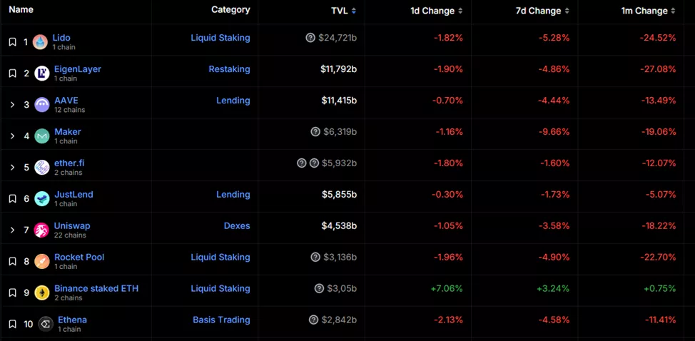 Общий объем заблокированной стоимости (TVL) в DeFi-протоколах обвалился до $82,9 млрд. Лидером остается Lido с показателем $24,7 млрд. На второй строчке — EigenLayer ($11,8 млрд), третью удерживает Aave ($11,4 млрд).