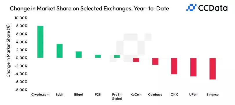 Одним из бенефициаров падения объемов на Binance стала Crypto.com. Ее совокупный показатель увеличился более чем на 40% месяц к месяцу. С начала года биржа зафиксировала самый большой прирост в спотовой торговле, увеличив долю рынка до 10,5%.