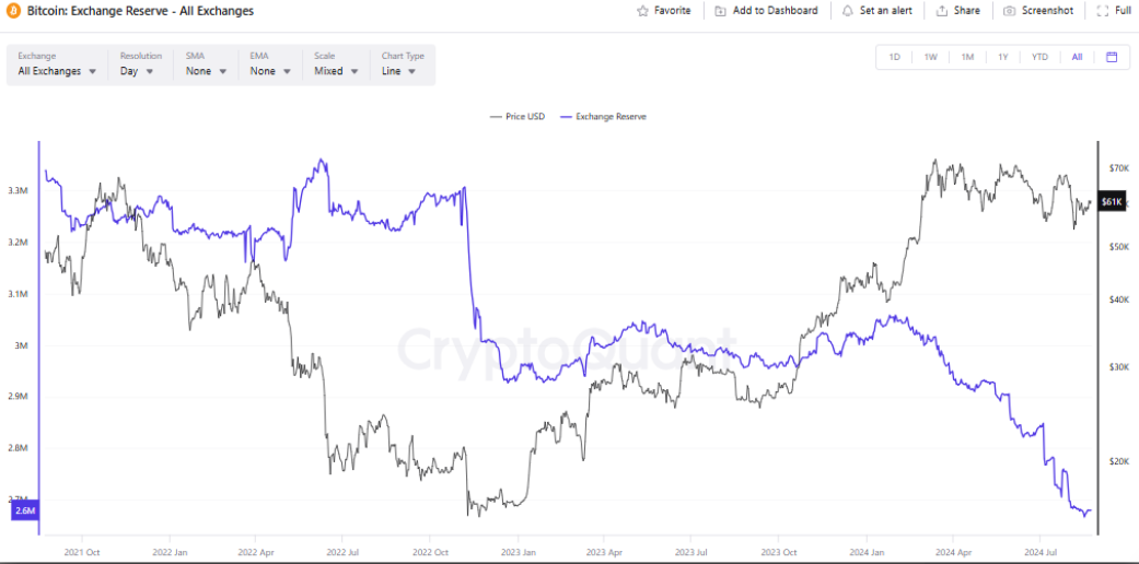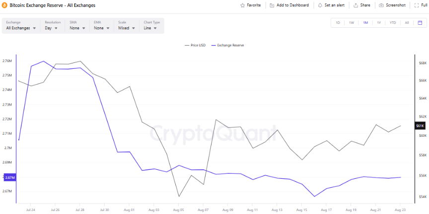 Резервы биткоинов на централизованных биржах в августе снизились до многолетнего минимума. С конца июля значение упало с 2,75 млн до 2,67 млн.