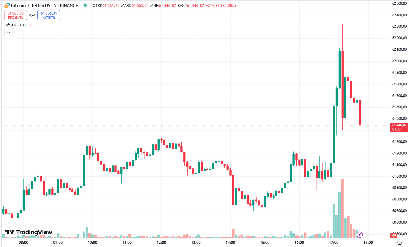 Биткоин на фоне выступления Пауэлла вырос к отметкам $62 350, но вскоре откатился.