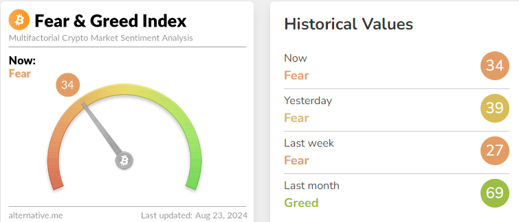 Тем временем индекс страха и жадности сигнализирует о страхе на рынке — он достиг 34 пунктов.