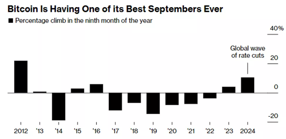 За неполный сентябрь курс первой криптовалюты вырос более чем на 10%. Динамика контрастирует с типичным для этого месяца падением в среднем на 5,9%, пишет Bloomberg.