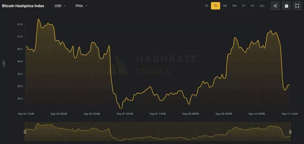 По данным Hashrate Index, на фоне роста сложности майнинга хешпрайс за последние 24 часа упал с $41 за PH в сутки до $39.