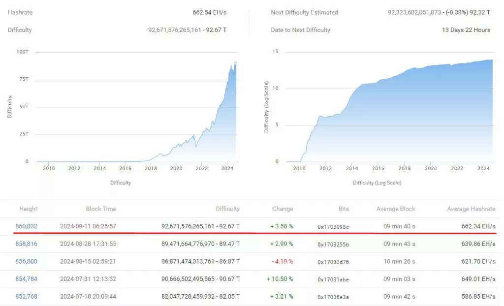 Средний хешрейт за период с предыдущего изменения значения составил 662,34 EH/s, межблочный интервал сократился до 9 минут 40 секунд.