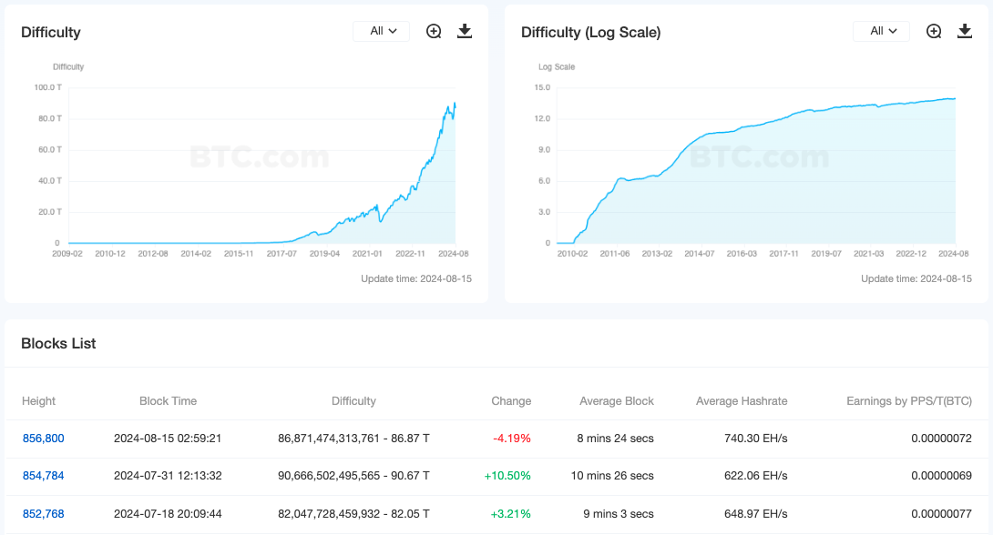 Средний хешрейт за период с предыдущего изменения значения составил 740,3 EH/s, интервал между блоками — восемь минут и 24 секунды.