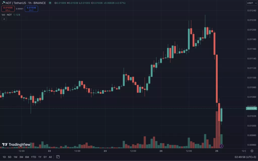 Падением на новость о задержании Дурова отреагировал и поддерживаемый им Notcoin (NOT). На момент написания токен торгуется по $0,1, потеряв за сутки 9,8%.