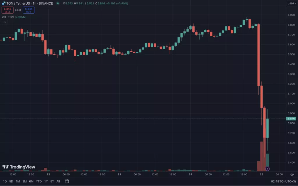На фоне новости котировки Toncoin (TON) обвалились ниже отметки $6. Актив потерял 13,2% за последние сутки, согласно CoinGecko.