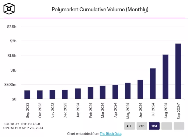 График ниже иллюстрирует динамику объемов торгов Polymarket по месяцам, нарастающим итогом: