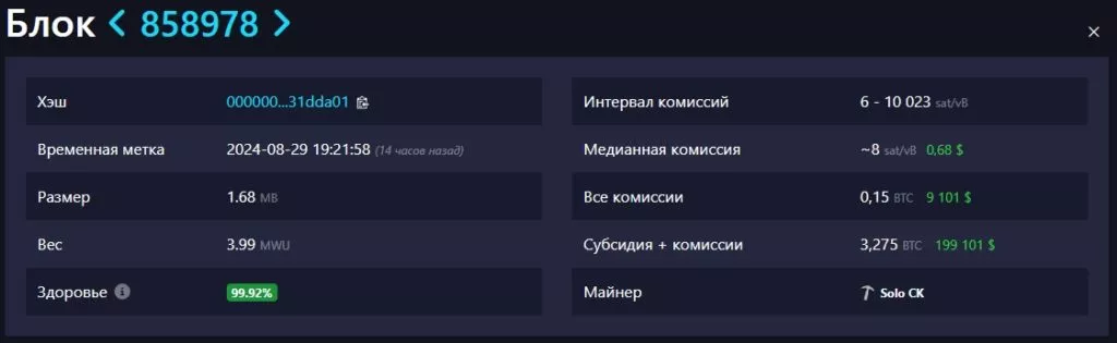 29 августа майнер-одиночка включил блок #858 978 в блокчейн первой криптовалюты и заработал 3,275 BTC ($199 101) в качестве субсидии и комиссий.