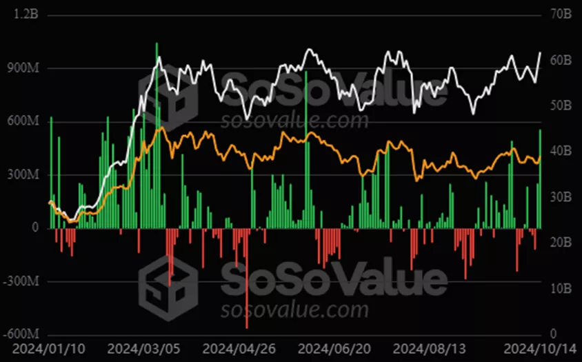 14 октября поступления в спотовые биткоин-ETF составили $555,9 млн — максимум с 4 июня, согласно SoSoValue.