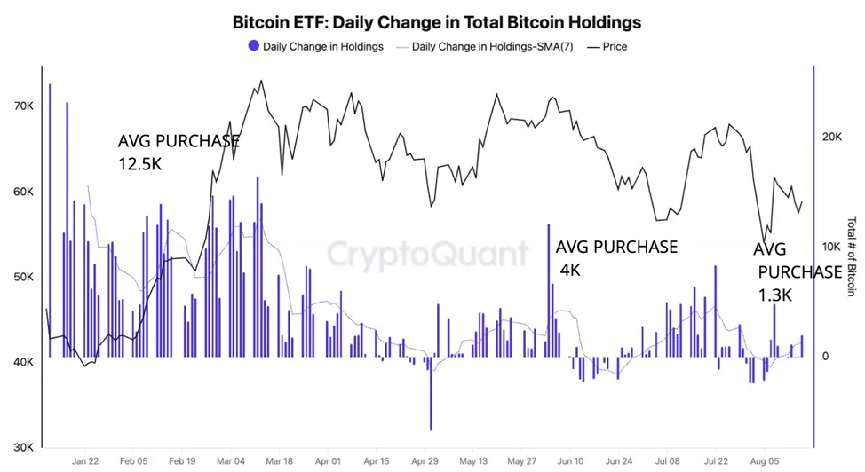 Ранее аналитики CryptoQuant определили, что спрос на первую криптовалюту (30 DMA) упал с 496 000 BTC в апреле до -25 000 BTC в августе.