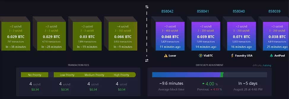 23 августа средняя комиссия за транзакцию опустилась до $0,34, согласно Mempool.
