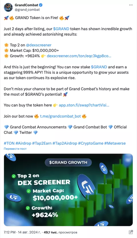 Запущенный 11 августа токен игрового проекта Grand Combat (GRAND) вырос на 9624% в паре к Toncoin (TON) в течение двух дней после листинга. Рыночная капитализация проекта превысила $10 млн. Об этом команда Grand Combat сообщила в X.