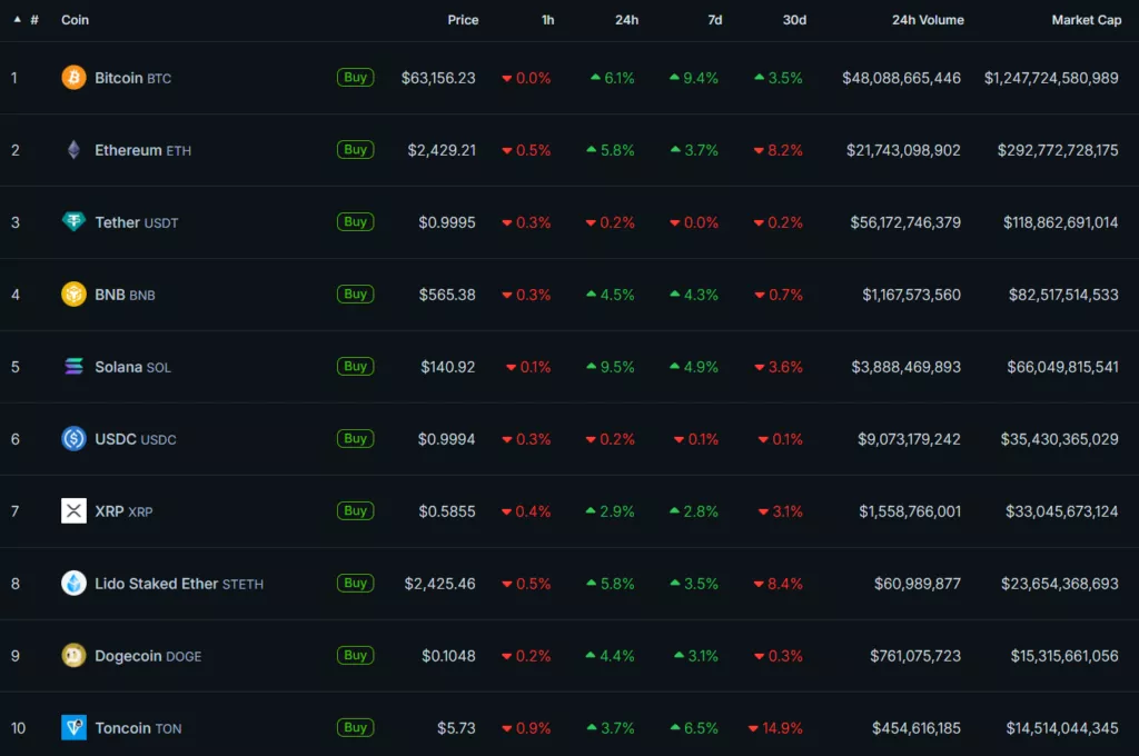 «По старой традиции», рост флагмана оживил остальной рынок. Так выглядит топ-10 криптоактивов по капитализации: