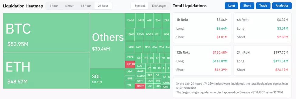 Согласно Coinglass, совокупный объем ликвидированных позиций за сутки составил $197,7 млн. Из них $171,5 млн пришлось на лонги.