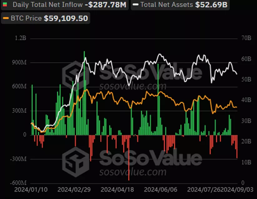 3 сентября чистый отток из спотовых биткоин-ETF составил $287,7 млн, согласно SoSoValue. Отрицательное значение стало третьим по величине в истории.