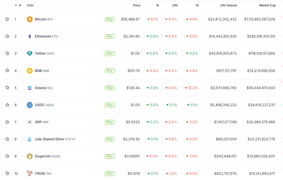 На момент написания биткоин торгуется по $56 470, потеряв 4,3% за последние 24 часа. Суточные темпы падения Ethereum ($2380) составляют 5,7%.