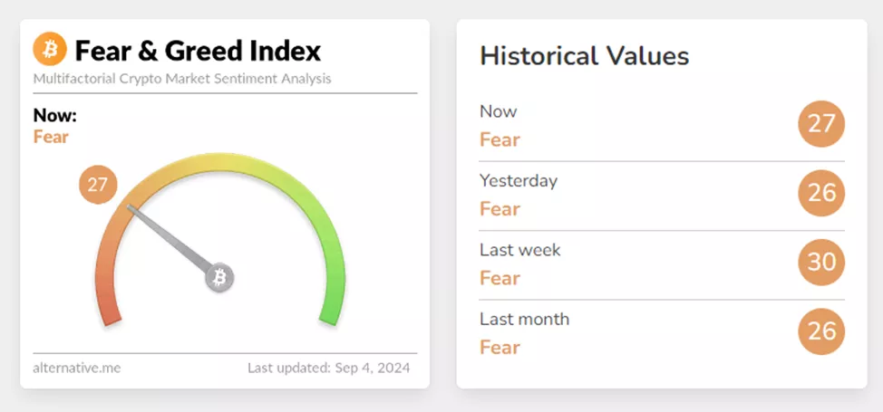 Индекс страха и жадности увеличился до отметки 27, свидетельствуя о росте медвежьих настроений. Накануне показатель составлял 26 пунктов.