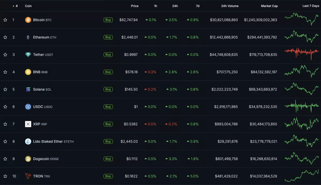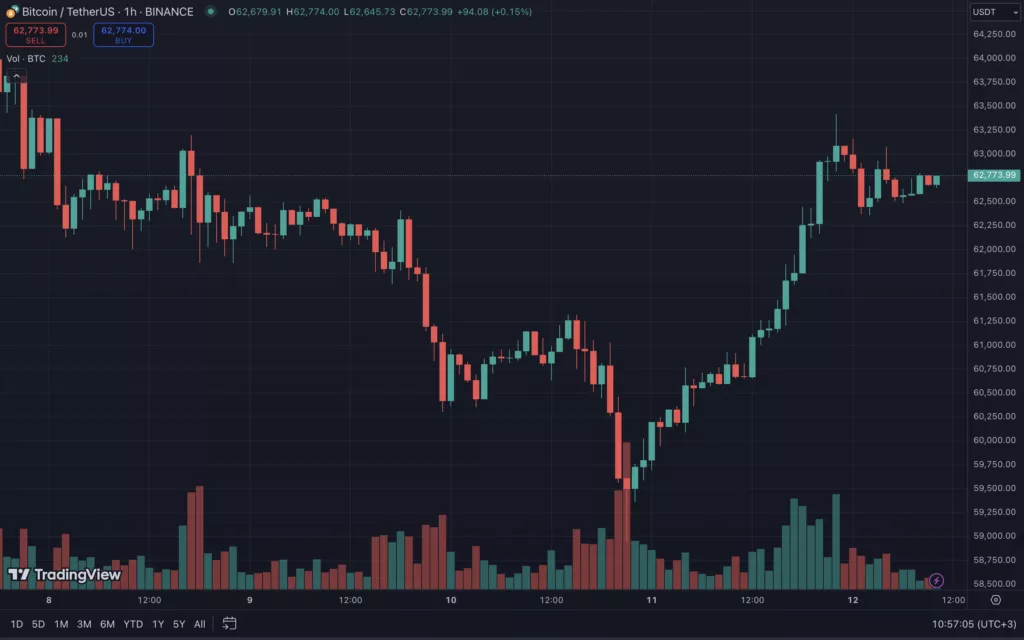На момент написания цифровое золото скорректировалось к $62 700. Прибавка за сутки составила 3,5%, согласно CoinGecko.