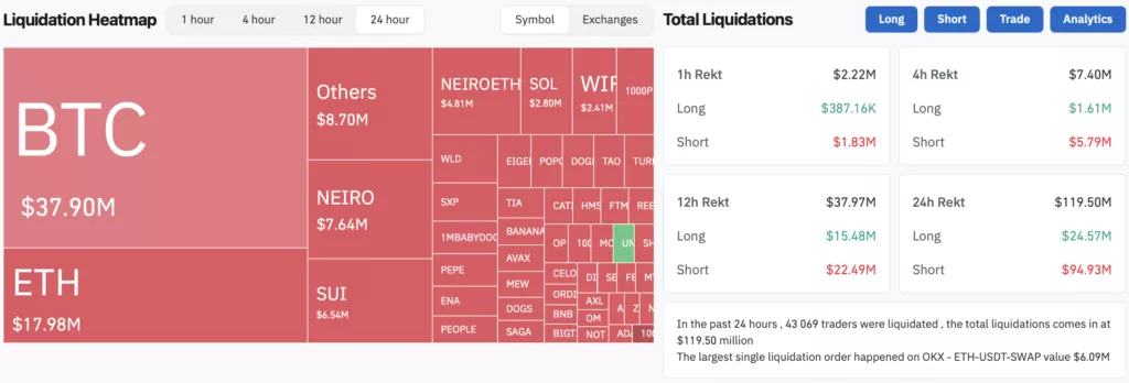 Согласно Coinglass, совокупный объем ликвидированных позиций за сутки составил $119,5 млн. Из них почти $95 млн пришлось на шорты.