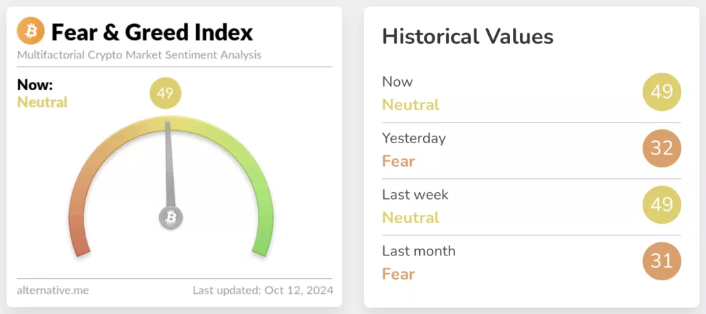 Индекс страха и жадности поднялся к отметке 49, свидетельствуя о нейтральном уровне.