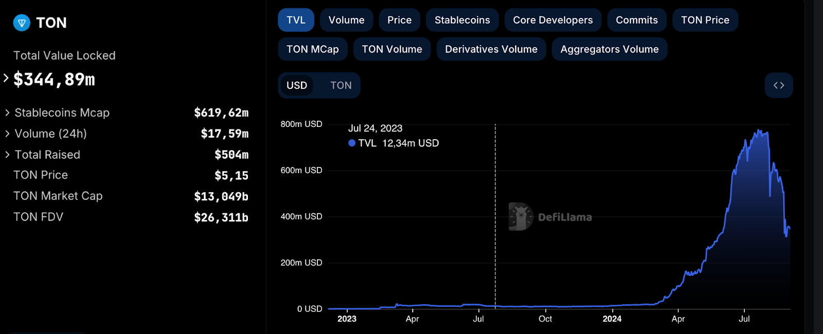 Наряду с этим в сети происходит отток TVL, которая снизилась с июльского пика в $776,6 млн до $344,89 млн.