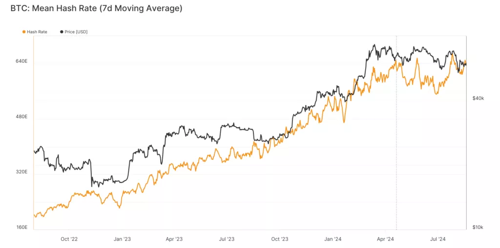 В начале августа хешрейт скорректировался к уровням около 611 EH/s и к моменту написания не восстановился до прежних рекордных отметок.