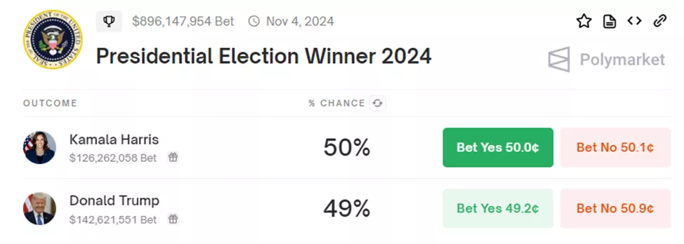 Согласно платформе предсказаний Polymarket, Харрис опережает Трампа на 1%. Объем ставок на исход приблизился к $900 млн.