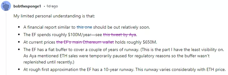 «Примерная бюджетная стратегия заключается в том, чтобы тратить 15% от оставшихся денег каждый год. Это подразумевает путь, по которому EF сможет двигаться вечно, постепенно уменьшаясь как часть экосистемы», — прокомментировал в сабреддите соучредитель Ethereum Виталик Бутерин.
