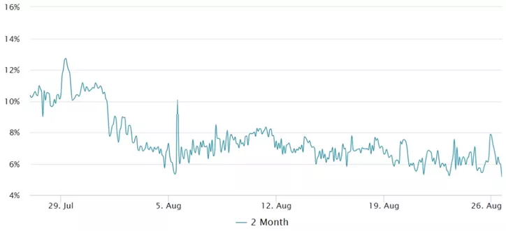 Рынок биткоин-фьючерсов также демонстрирует осторожность трейдеров. Премия по двухмесячным контрактам к спотовой цене в течение последнего месяца в пересчете на годовые темпы оставалась на уровне около 6%, отражая неготовность к наращиванию левериджа.