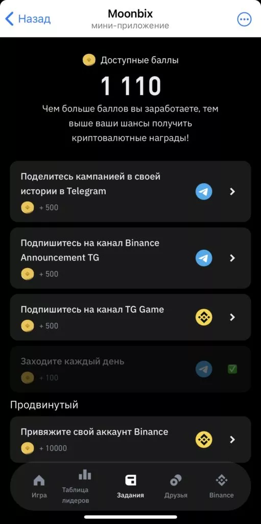 В игре есть раздел с заданиями: подписаться на Telegram-канал, поделиться в истории и привязать свой аккаунт Binance.