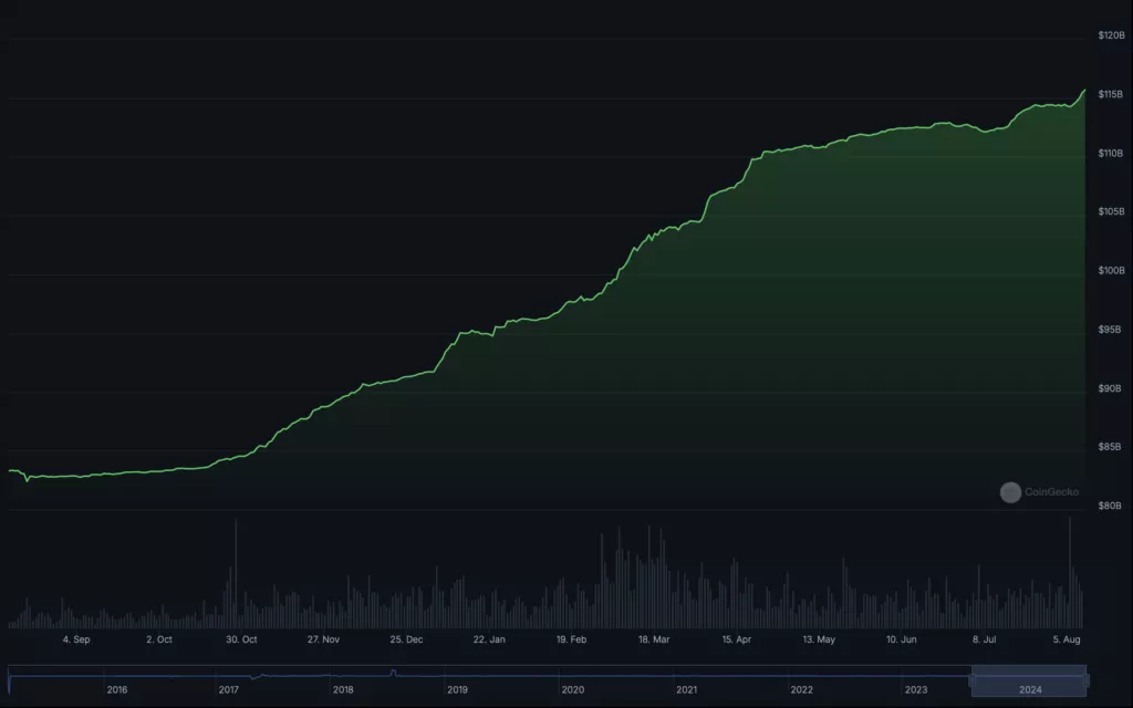 8 августа общая рыночная стоимость стейблкоина USDT превысила $115 млрд, согласно CoinGecko. Такой показатель обеспечивает эмитенту Tether почти 70% долю рынка «стабильных монет».