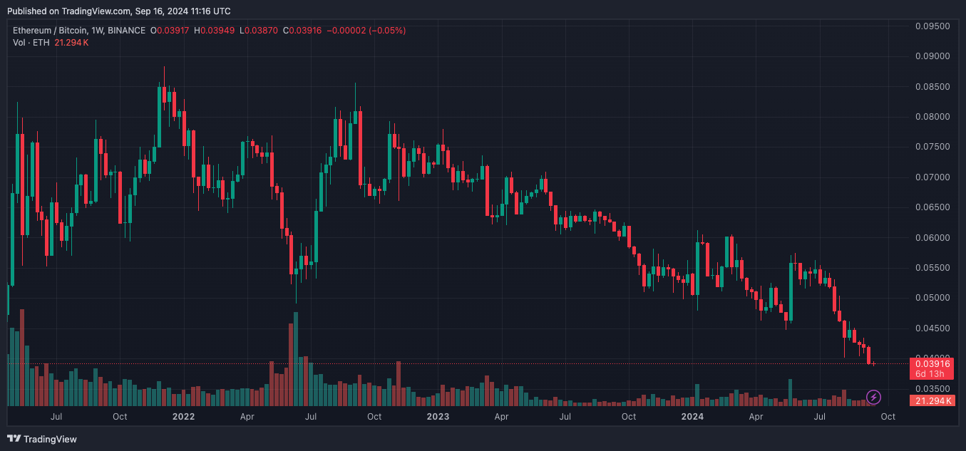 Кроме того, пара ETH/BTC достигла минимума за 3,5 года на отметке ниже 0,04 BTC. С момента активации обновления The Merge в сентябре 2022 года просадка составила 53%.
