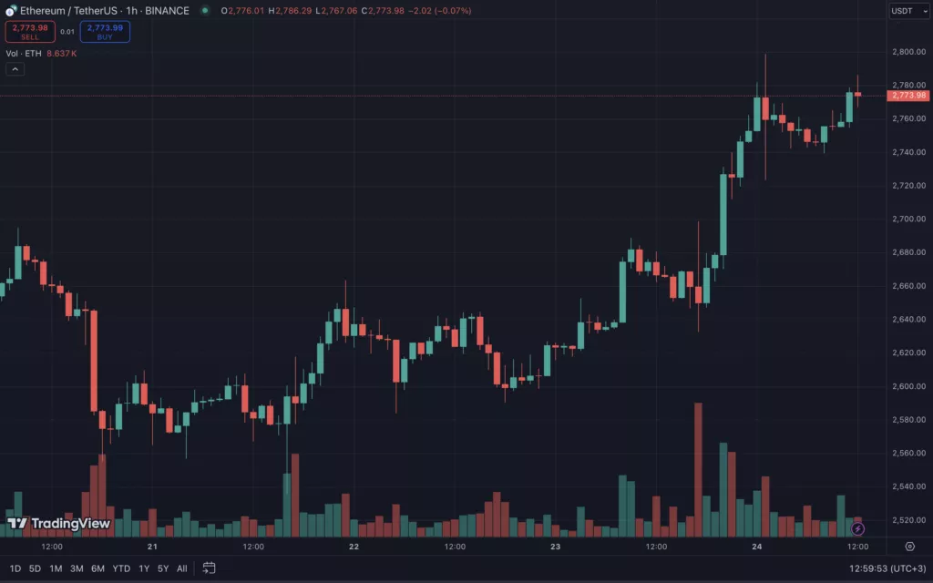 На момент написания Ethereum торгуется по $2770, прибавив 4,1% за последние сутки, согласно CoinGecko.