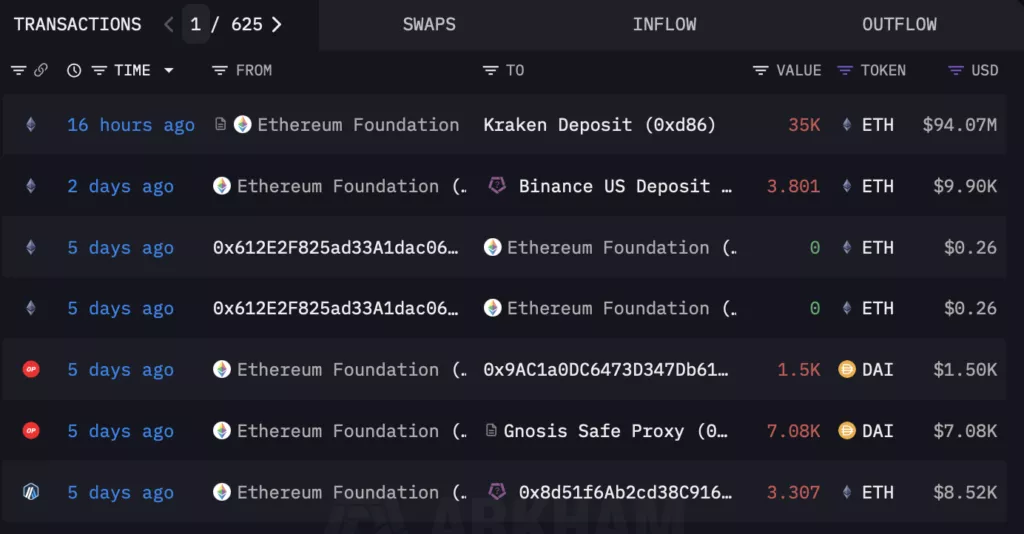 Зарегистрированная в Швейцарии некоммерческая организация Ethereum Foundation переместила 35 000 ETH ($94 млн по курсу на момент транзакции) на криптовалютную биржу Kraken.