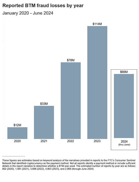 Федеральная торговая комиссия США (FTC) подсчитала, что с 2020 по 2023 год потери от мошенничества с криптовалютными банкоматами увеличились почти в десять раз. За первую половину 2024 года они превысили $65 млн, реальный ущерб может быть гораздо выше.