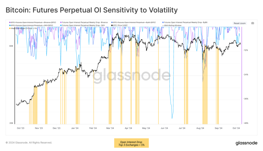 Во время недавнего ралли на рынке бессрочных контрактов открытый интерес сократился на $2,5 млрд из-за ликвидации шортов. Доля снижения метрики на трех ведущих бессрочных биржах не превысила порогового значения в 5% 🟨.