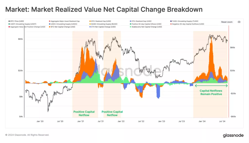 Анализ чистого изменения капитала дает положительные изменения по биткоину, Ethereum и стейблкоинам. Только в 34% торговых дней наблюдался более значительный 30-дневный приток номинированного в долларах США капитала в долларах США. Тенденция наблюдалась, невзирая на коррекцию после ATH в марте.