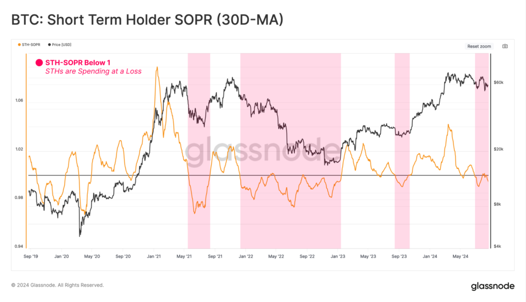 По мере роста нереализованных убытков растет ожидание того, что спекулянты в итоге капитулируют, потратив приобретенные монеты. Подобные периоды реализации больших потерь новыми инвесторами возникают, когда SOPR уходит ниже равновесного значения 1,0.