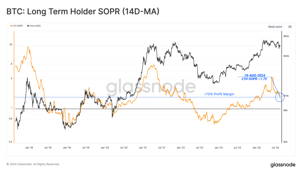 С точки зрения SOPR средняя прибыль ходлеров составляет 75% и остается на высоком уровне.