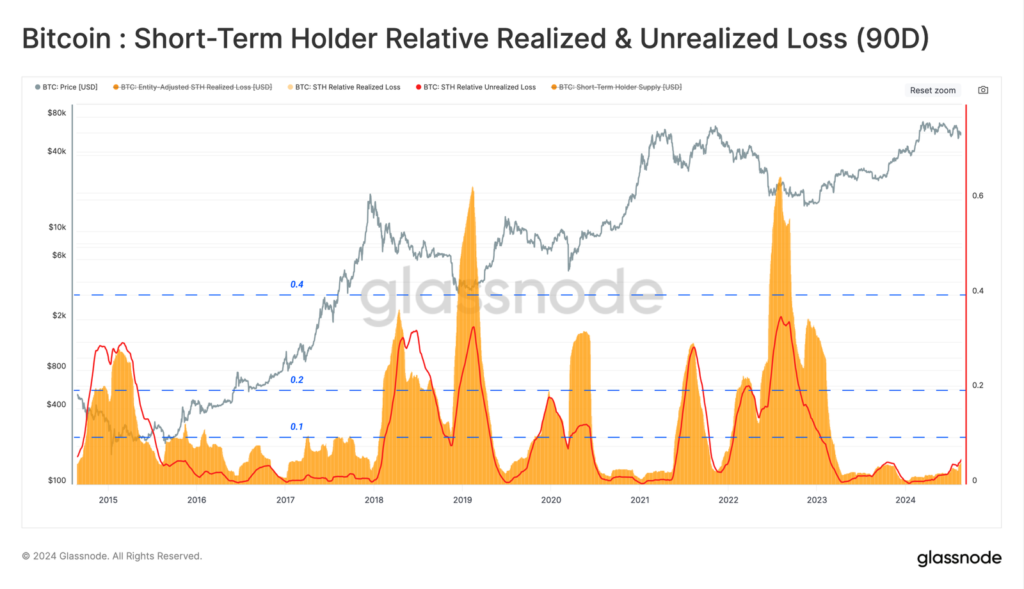 В заключении аналитики сравнили 90 DMA реализованного и нереализованного убытка применительно к спекулянтам. Согласно специалистам, в период формирования циклических минимумов цены величина двух величин колеблется в диапазоне от 10% до 60% относительно совокупного капитала краткосрочных инвесторов.