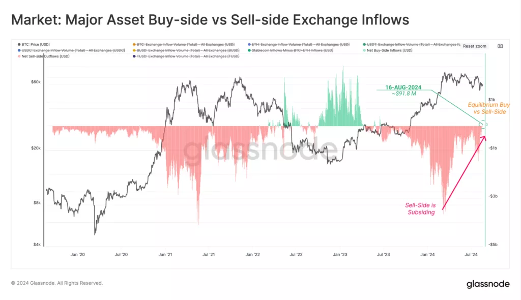На следующем шаге аналитики воспользовались метрикой Buy-Side vs Sell-Side для выявления сдвигов в динамике капитала в биткоин и Ethereum вместе взятые.