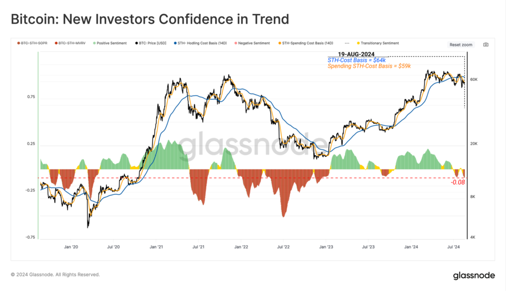 На приведенном ниже графике сравнивается средняя стоимость покупки монет новыми инвесторами, которые не совладали с эмоциями и вышли из позиции, и теми, кто их продолжает удерживать. Исходя из анализа спреда двух величин аналитики пришли к выводу, что при падении курса ниже $50 000 имела место умеренная чрезмерная реакция.