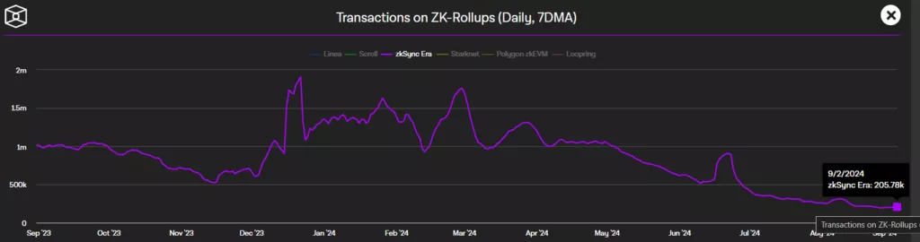 В июне проект провел аирдроп 3,6 млн токенов ZK. После масштабной раздачи ключевые показатели проекта существенно снизились.