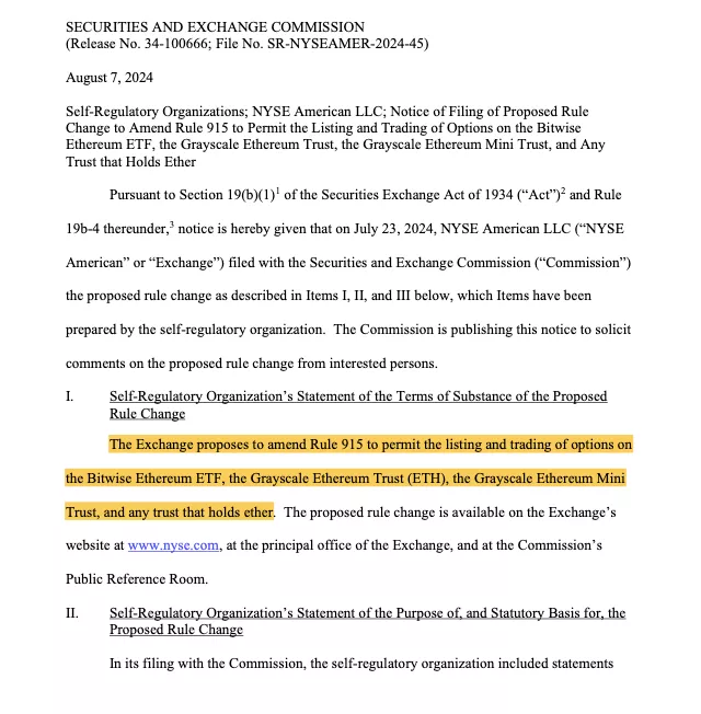 Нью-Йоркская фондовая биржа (NYSE) обратилась в SEC с предложением об изменении правил, позволяющих ей проводить листинг и предоставлять возможность торговли опционами на базе спотовых Ethereum-ETF от Bitwise и Grayscale.