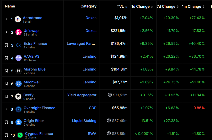 В начале года TVL Base составлял около $430 млн, к концу сентября показатель вырос на 370%. Децентрализованная биржа Aerodrome внесла наибольший вклад в рост — в ней заблокировано более $1 млрд. Следом идет Uniswap с $221 млн.