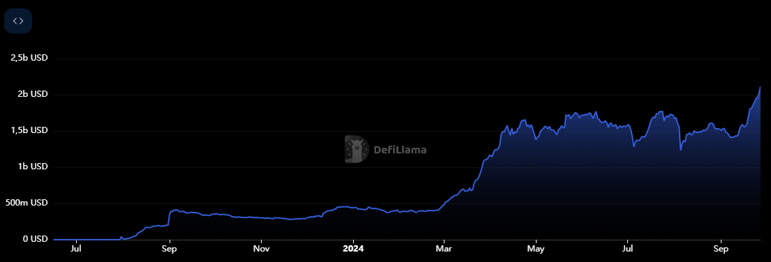 Общий объем заблокированной стоимости (TVL) сети Base впервые преодолел рубеж в $2 млрд.