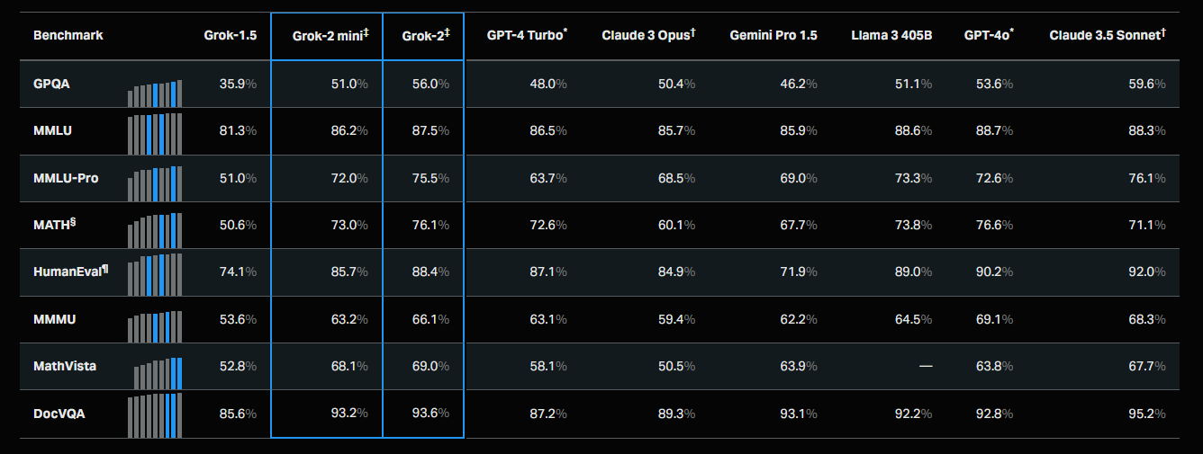 По ряду академических тестов, которые включают рассуждения, понимание прочитанного, математику, естественные науки и программирование, Grok-2 и Grok-2 mini продемонстрировали «значительные улучшения» по сравнению с предыдущей моделью.